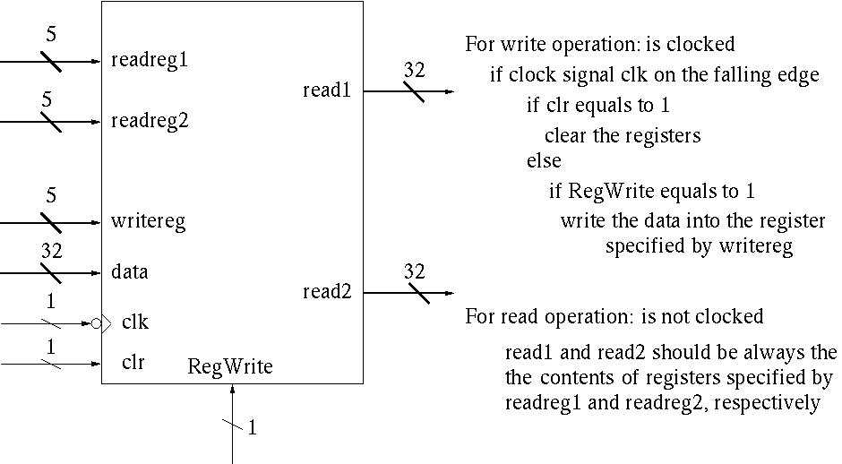 The write operation takes place on the falling edge of the clk signal when the Write control (RegWrite) is logical 1. The read operation, however, is not clocked - it is combinational. Thus, the value of Read data 1 (read1) should always be the contents of the register specified by the Read register number 1. Similarly, the value of Read data 2 (read2) should always be the contents of the register specified by the Read register number 2. The following figure and table give the description of the register file. The table only describes the cases when clear signal clr is 0. When the clear signal clr is 1, clear the registers.