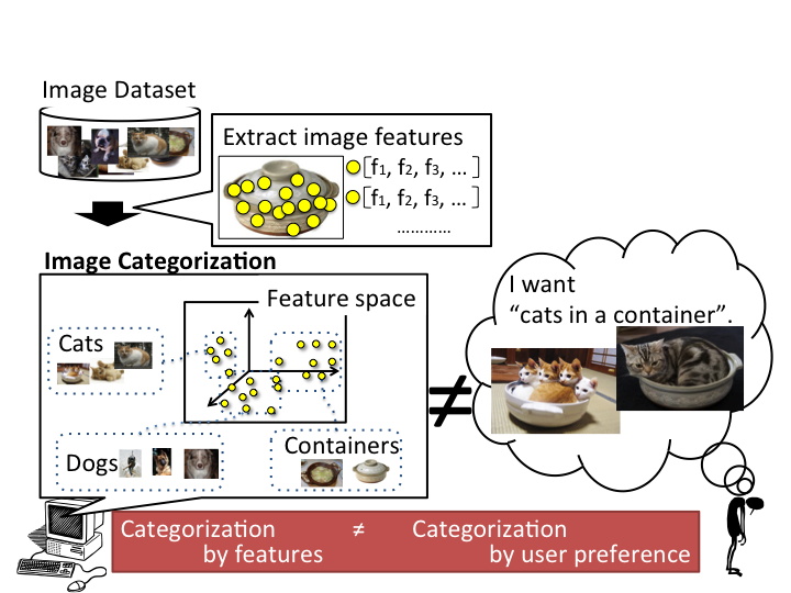 On the other hand, we usually have our own categorization of the images and try to rearrange the images in the feature space to best meet our expectations.