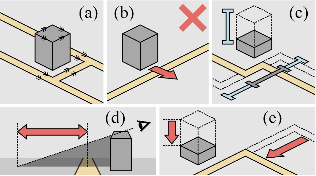 本手法では,地図の視認性を高めるために, 5つの設計基準を用いることしました. それらは,線の向きの固定(Fixed orientation) (図1(a)), 相対位置関係(Relative position) (図1(b)), 拡大率の限界(Scale limits) (図1(c)), 移動量の最小化(Minimum displacement) (図1(d)), and 遮蔽の回避(Occlusion avoidance) (図1(e)) になります.