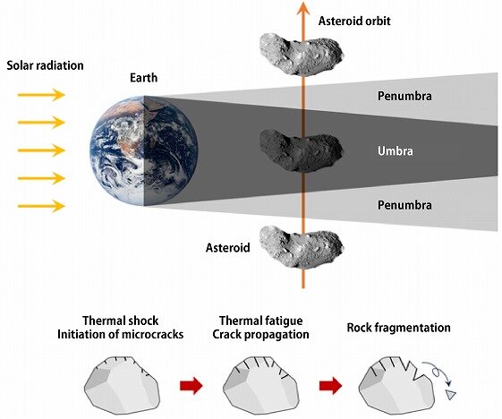 The research group focused on the fact that near-Earth asteroids pass through the shadows of Earth and Venus. By tracing asteroid orbits back in time, the researchers investigated how frequently asteroids pass through planetary shadows. The results showed that near-Earth asteroids pass through planetary shadows more frequently than they approach planets closely enough for tidal forces to have a significant effect. Furthermore, thermophysical simulations conducted under geometric conditions corresponding to shadow passages demonstrated that planetary shadows can produce thermal shocks sufficient to generate initial cracks within rocks. These findings suggest that thermal shock caused by planetary shadows may be a primary mechanism driving surface rejuvenation on near-Earth asteroids.