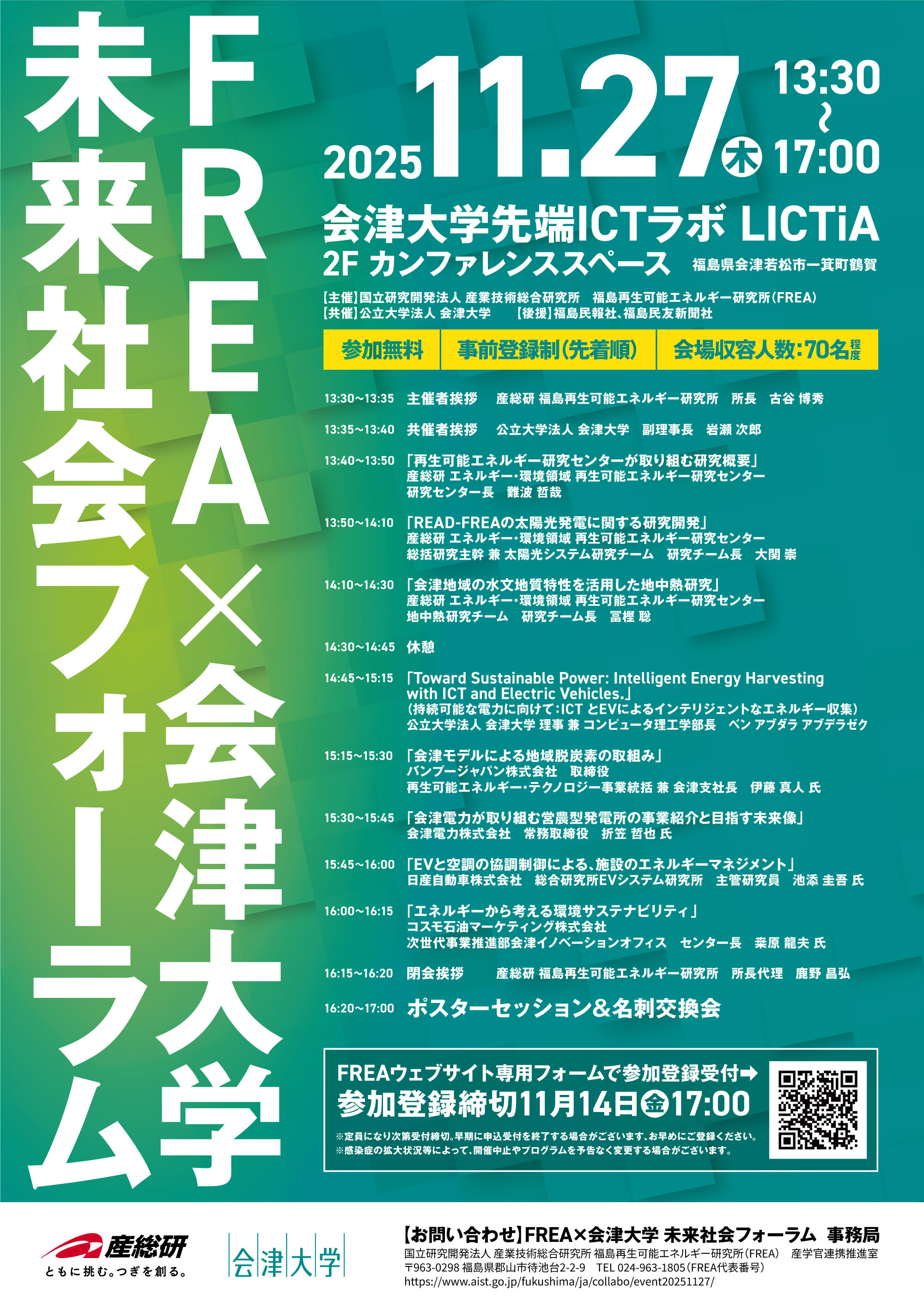 産総研 福島再生可能エネルギー研究所(FREA)と会津大学は、地域の新たな産学官連携構築の足掛かりとするため、研究内容紹介および地域企業の活動紹介を行う「講演会」および「ポスターセッション&名刺交換会」を開催します。