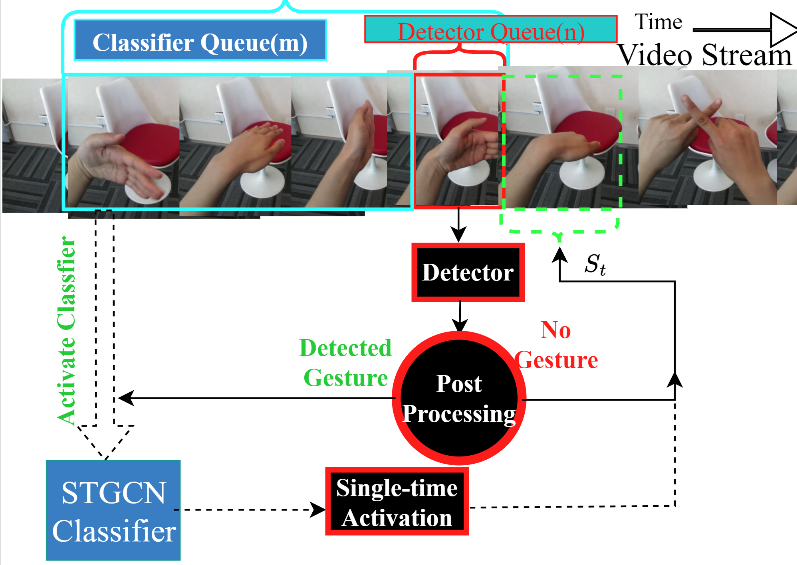 本プロジェクトは、人間と機械のインタラクションのために、生のビデオデータに対してSeparable Temporal Graph Convolutional Neural Network (STGCN) を用いたビジョンベースのジェスチャー認識手法を開発するものです 。システムはスライディングウィンドウ技術と検出器キュー(detector queue)を用いて入力フレームを処理します 。軽量な検出器がジェスチャーを特定した時のみ、計算負荷の高い分類器(classifier)を起動させる点が特徴で、これによりオフラインで学習されたモデルをリアルタイムシステムに効率的に統合することを可能にします 。