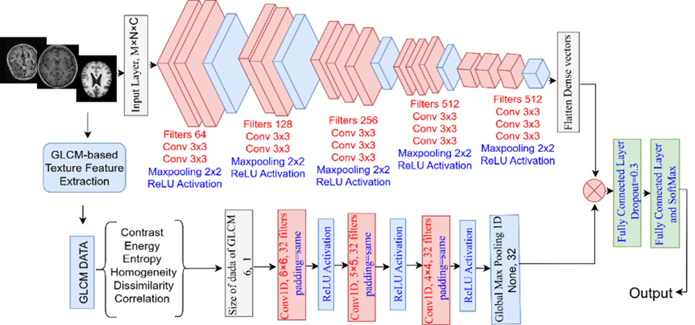 本研究は、自動化された深層特徴量とテクスチャ特徴量を統合することで、神経疾患を診断するための新しいハイブリッド深層学習(DL)アプローチを提案します 。このモデルはデュアルストリームアーキテクチャを採用しており、改良されたVGG16 CNNがMRIスライスから深層特徴量を抽出し、シーケンシャル1D CNNがGray-Level Co-occurrence Matrices (GLCM) から得られる6つの統計的な手作りのテクスチャ特徴量を処理します 。これらの相補的な特徴量セットを融合することで、既存の単一疾患診断モデルの限界を克服し、広範な神経疾患に対して高い精度を実現することを目指しています 。