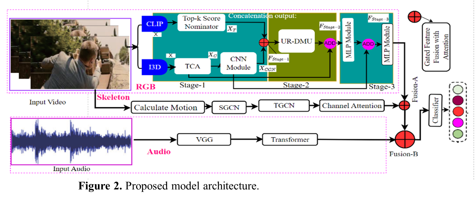 本研究は、RGBビデオ、骨格(スケルトン)、音声を組み合わせたマルチモーダルデータセットを活用し、アテンション強化型特徴融合アプローチを用いた新しい異常検知システムを提案します 。単一ソースのシステムとは異なり、この手法は3つの異なるデータストリームを統合し、各モダリティが抽出した相補的な特徴量を強化されたアテンションモジュールによって洗練させます 。空間的、時間的、聴覚的な手がかりを効果的に組み合わせることで、リアルタイム検知における精度とスケーラビリティの向上を目指しています 。