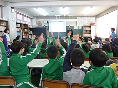 両国の言語に関してはベトナムでは1945年以前は漢字を使用していた歴史があったそうです。またチュニジアでは家族と友達の間ではアラビア語を話し、学校ではフランス語で授業が行われているそうです。 アラビア語とフランス語の2つが公用語であることを知り、子どもたちからは「すごい」という声が聞かれました。留学生からの母国に関するクイズをだされると子どもたちは元気よく答えていました。 最後は子どもたちから留学生へ歌のプレゼントがありました。