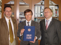 両大学と会津大学は昨年10月に大学間協定を締結しており、今回の訪問では、先の協定に基づく大学院間の デュアルディグリープログラムについて合意しました。平成20年度秋季のプログラム開始を前に、大学間で検討すべき項目をまとめた 覚書が作成され、ノボシビルスク国立工科大学とは8月28日(火)、ノボシビルスク国立大学とは9月7日(金)にそれぞれ調印が行われました。