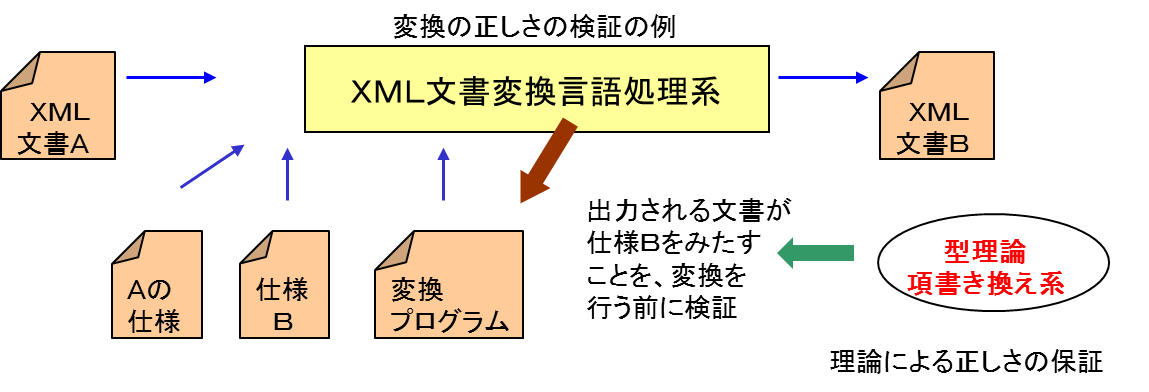 変換プログラムがこのようなことを起こさない、つまりプログラムが行う変換が「正しい」ことを、変換を行う前に検証できるようなXML文書変換言語を設計しています。